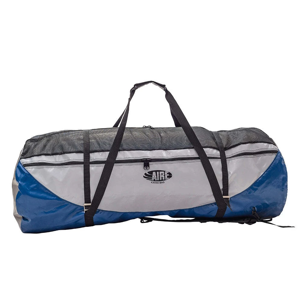 The AIRE Inflatable Kayak Bag is a duffel-style bag that fits most 1 or 2 person inflatable kayaks plus a pump, breakdown paddle, and other gear. It features 2 external pockets, 2 internal pockets and removable backpack shoulder straps.