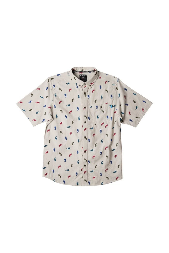 Casual fit, short sleeve button up, button-down collar with interior KAVU logo jacquard tape, single chest pocket with button closure, 25% certified recycled polyester faux wood buttons, back bias cut yoke with center back box please, curved hem.