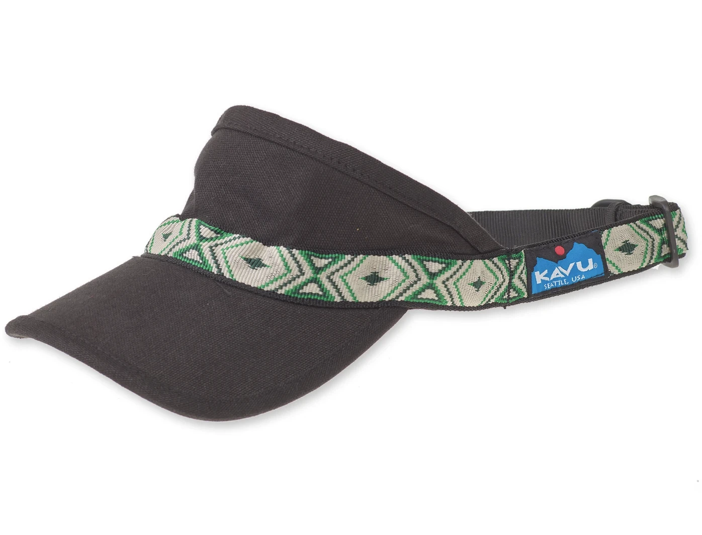 Low profile visor, slight curved bill, black underbill, patterned nylon tubular webbing with KAVU adjustment.